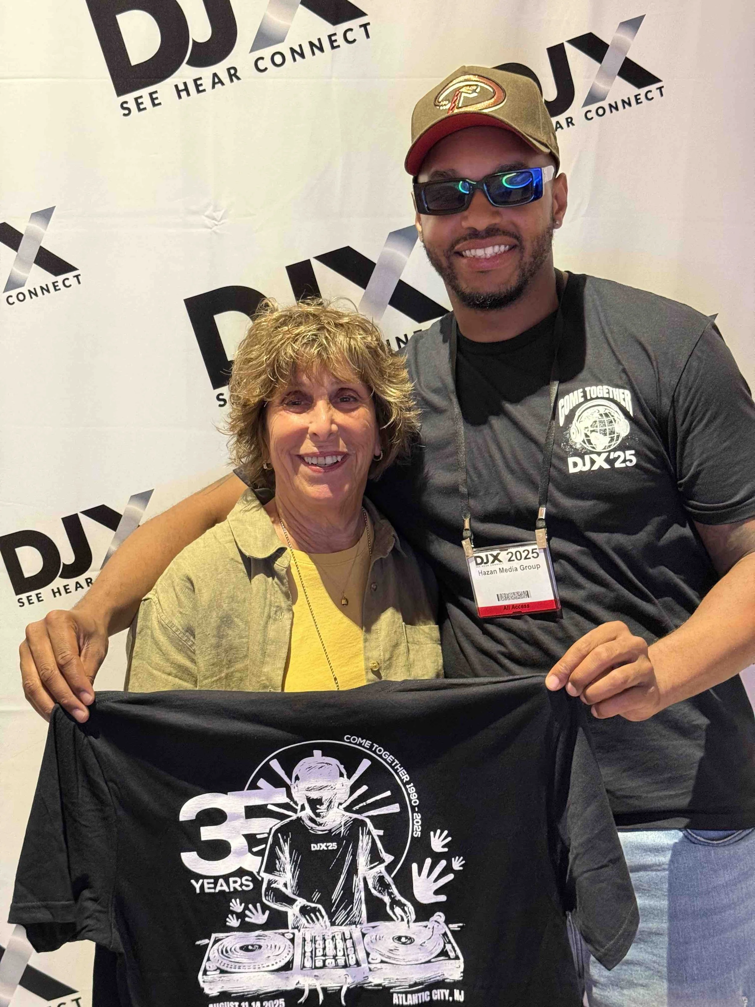 Robin Hazan (Hazan Media Group) with Brody Baker and his winning t-shirt design at DJX ‘25.